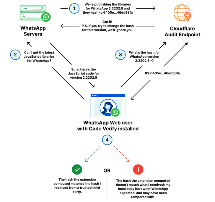 The system works with Cloudflare acting as a third-party audit to compare the cryptographic hash of WhatsApp Web’s JavaScript code that’s shared by Meta with that of a locally computed hash of the code running on the browser client.