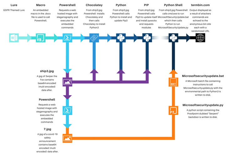 Also retrieved by the same PowerShell script is another image file from the same remote server that includes the camouflaged Python backdoor dubbed Serpent, which comes with capabilities to execute commands transmitted from the C2 server.